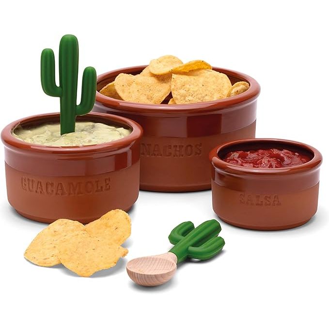 The Monkey Business Bowlero Dipping Bowls Set is a terracotta serving bowl set that includes three dipping sauce bowls and two dip spoons. This decorative Mexican serving bowl set is perfect for serving guacamole, salsa, BBQ sauce, soy sauce, and other Mexican dips at your next gathering or party. The terracotta material of the bowls adds a touch of traditional Mexican flair to your table setting.