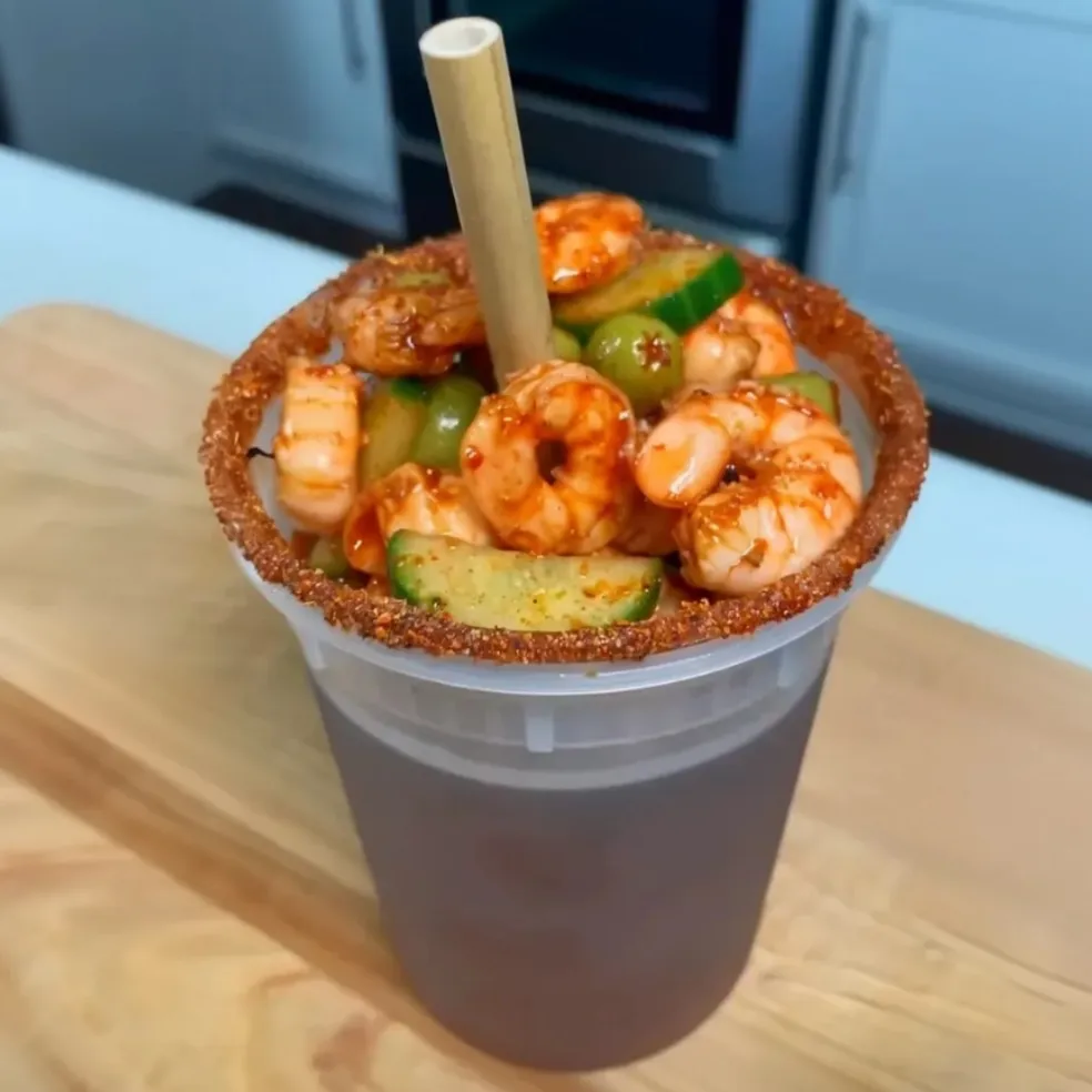- Sip the vibrant Michelada through the straw while enjoying the savory shrimp botana on top.