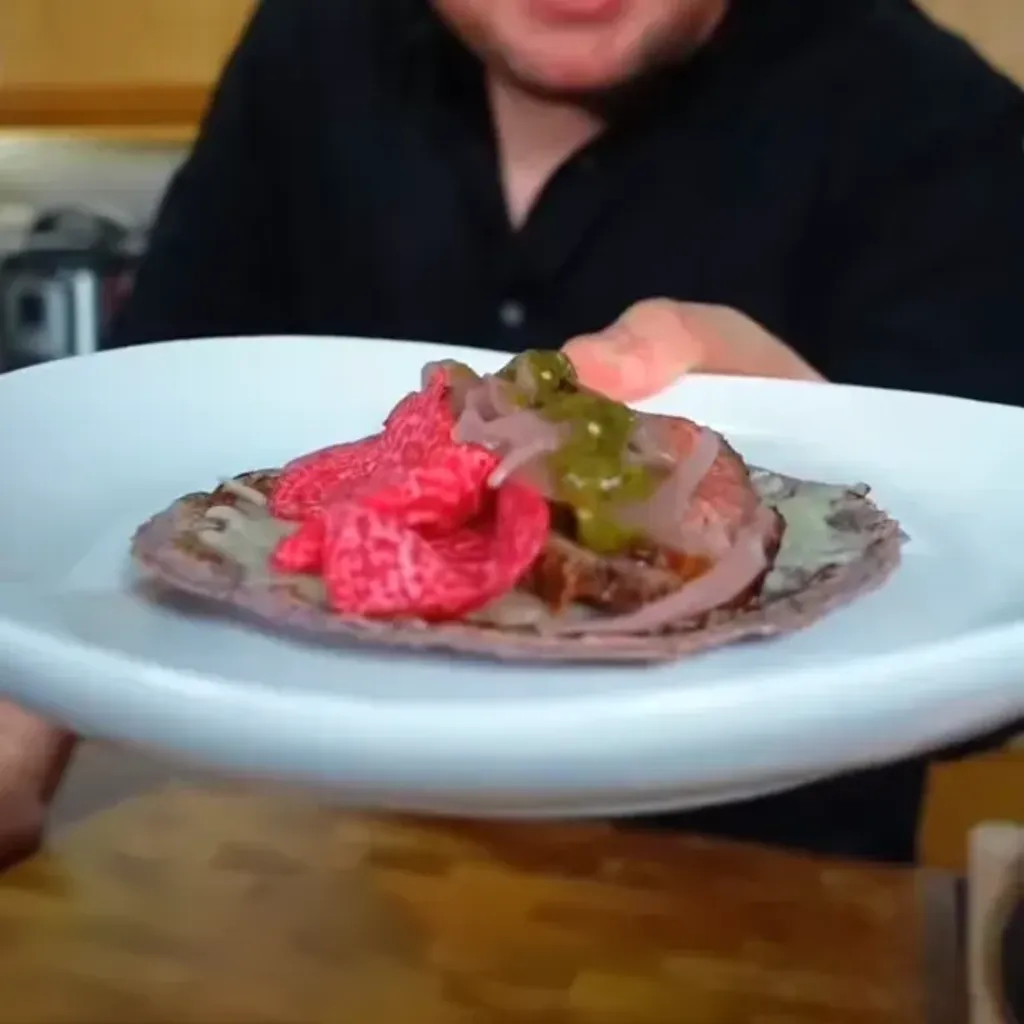- Place a tortilla on the skillet, sprinkle some mozzarella cheese on half of the tortilla, add slices of cooked steak, pickled onions, and pickled radishes.